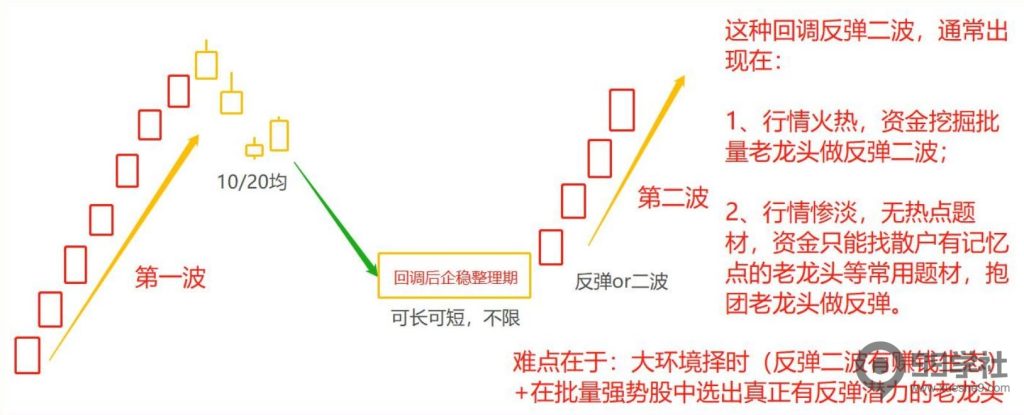 具体老龙头,前面 2-4 节牛股启动形态中的龙头二波里,给大伙讲过三种(平台整理突破型、直接反包二波型、调整反弹二波型),这里的老龙头反弹,更多专指第三种-调整反弹二波型。